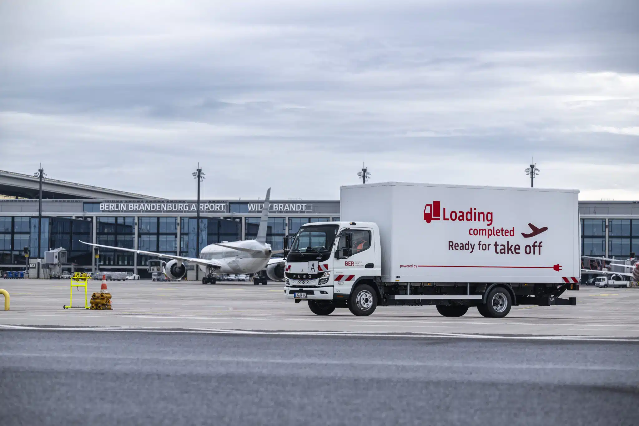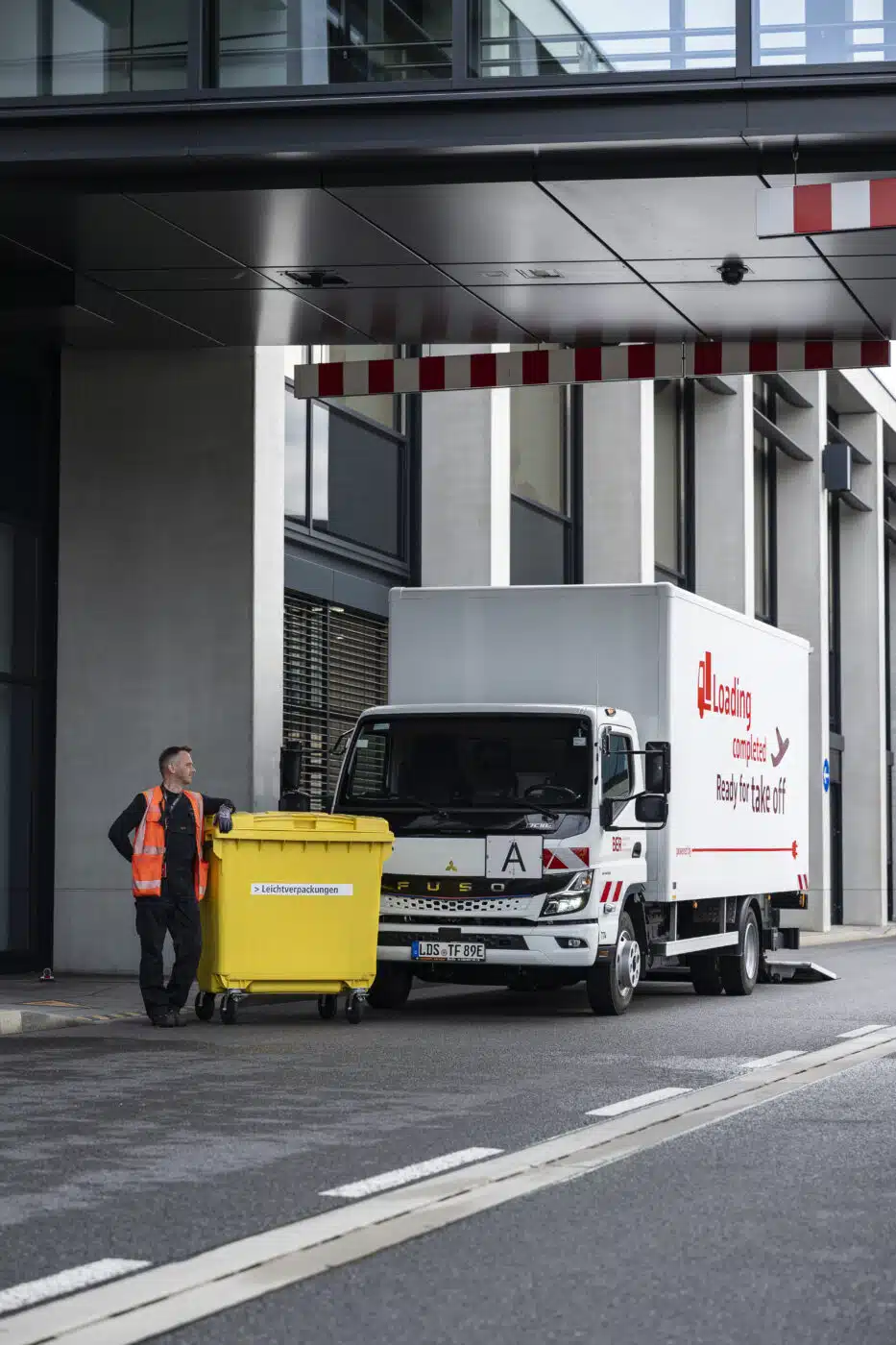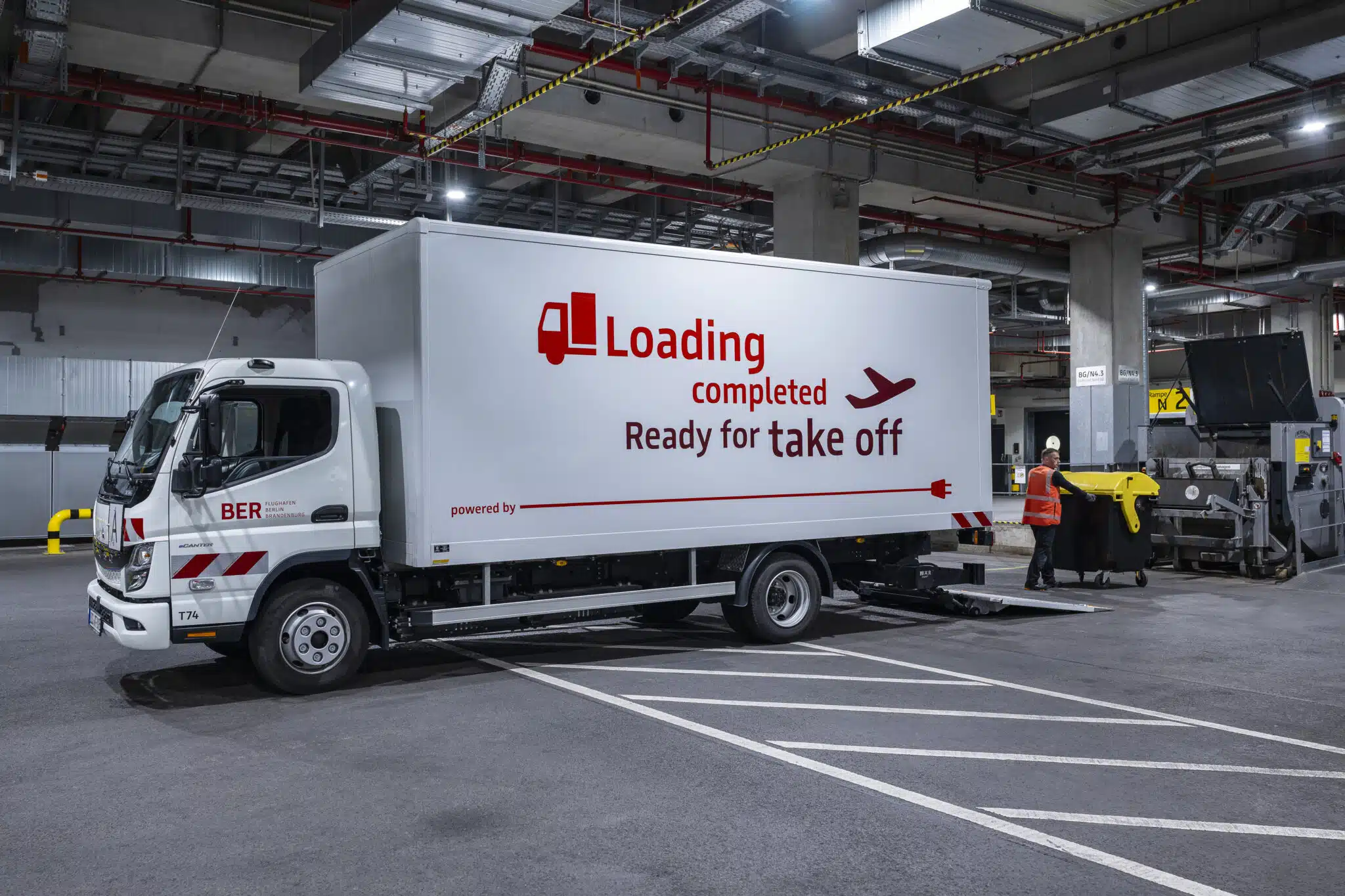 Depuis un an et demi, l’aéroport de Berlin-Brandebourg GmbH mise sur l’électromobilité dans le cadre de sa stratégie de développement durable pour le traitement de sa logistique interne des déchets et de l’élimination des déchets – comme le montre le FUSO eCanter 7C18e.