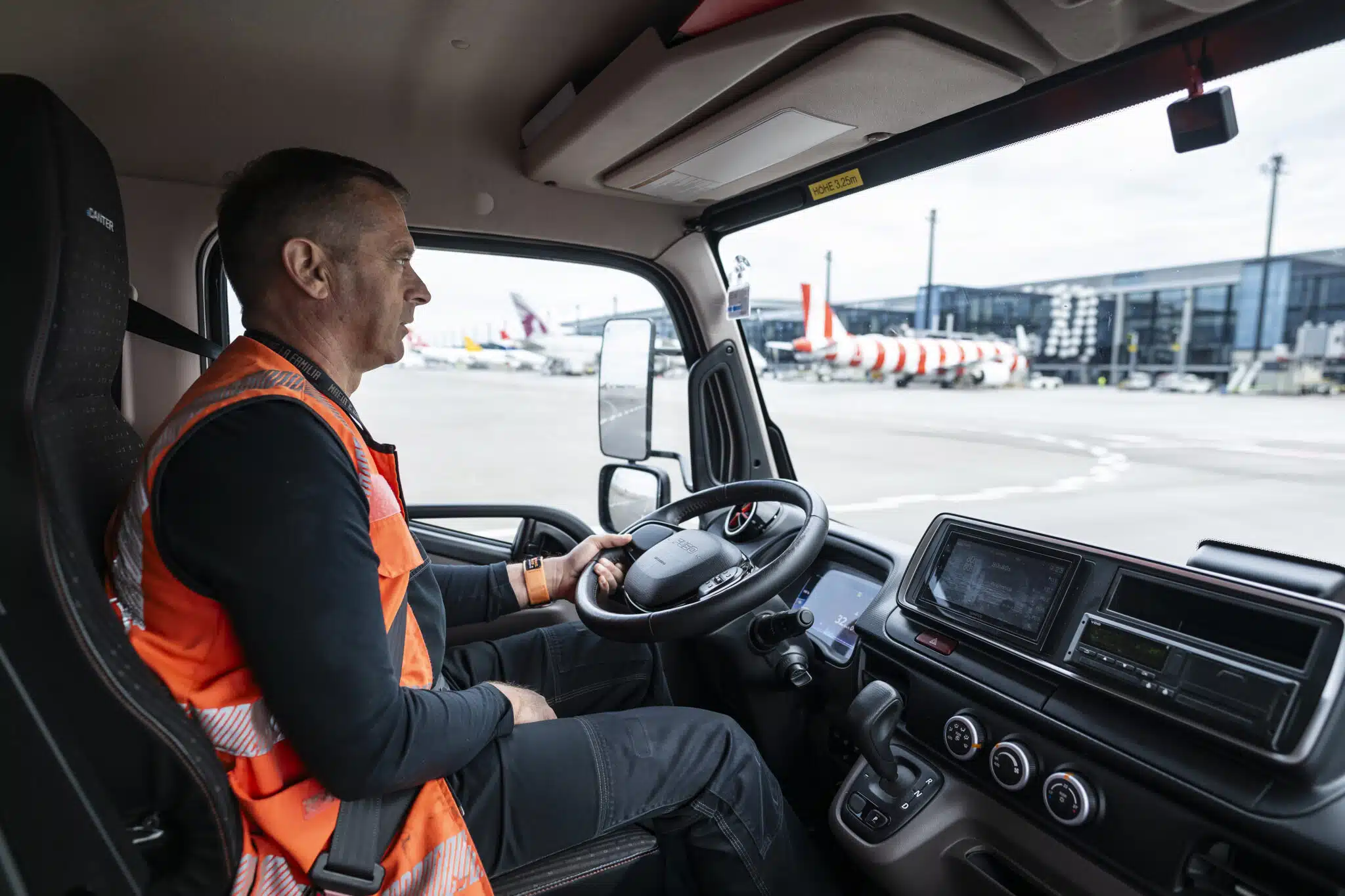 Alors que l’eCanter est manifestement le camion électrique idéal pour le travail de gestion des déchets au BER, le travail de conducteur présente également quelques exigences spécifiques. En effet, l’eCanter ne se rend pas seulement aux points de collecte des déchets situés sur le côté terrestre accessible au public, mais aussi sur le côté aérien derrière le contrôle de sécurité. Chaque collaborateur qui y a accès a besoin d’une autorisation de sécurité complète. Cette vérification de la fiabilité est effectuée par l’autorité de sécurité aérienne et relie les informations personnelles de différentes autorités telles que la police, la protection constitutionnelle et l’Office fédéral de la criminalité. Quiconque circule avec un véhicule sur les routes d’approvisionnement de l’aéroport a en outre besoin d’un permis de conduire aéroportuaire spécial comprenant des cours théoriques et pratiques ainsi qu’un examen. D’ailleurs, il y a évidemment des éclairs sur le terrain.