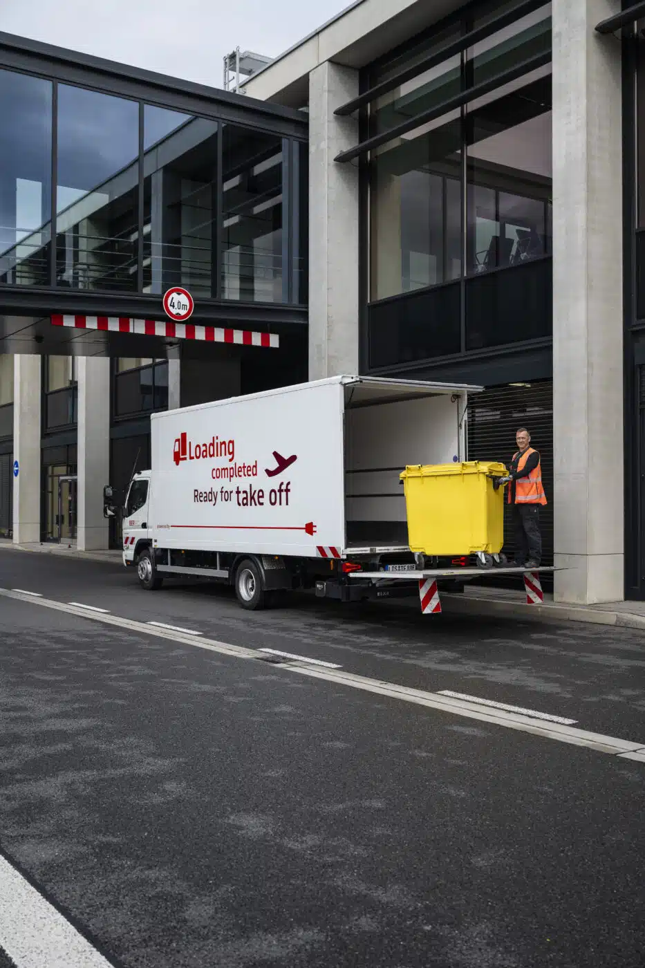 Une chose était claire : un véhicule diesel ne devrait pas revenir, car ils ne sont pas utilisés sur les trajets courts et nécessitent donc trop d’entretien. Après une analyse approfondie, les données clés ont été établies : 7,5 tonnes, autonomie minimale de 70 kilomètres par jour, caisse avec hayon élévateur d’une tonne, charge utile d’au moins 2 tonnes plus un volume de chargement d’environ 25 mètres cubes pour les conteneurs les plus divers. « Je dois avouer que FUSO n’était pas du tout à l’écran au moment de la recherche », explique le spécialiste des déchets, « mais par rapport à d’autres fournisseurs, j’ai constaté que l’eCanter pouvait être adapté exactement à nos besoins grâce à ses nombreuses possibilités de configuration. C’est tout simplement parfait. » Depuis un an et demi, l’eCanter 7C18e circule sur le site de l’aéroport, a déjà vécu toutes les saisons et fonctionne parfaitement.