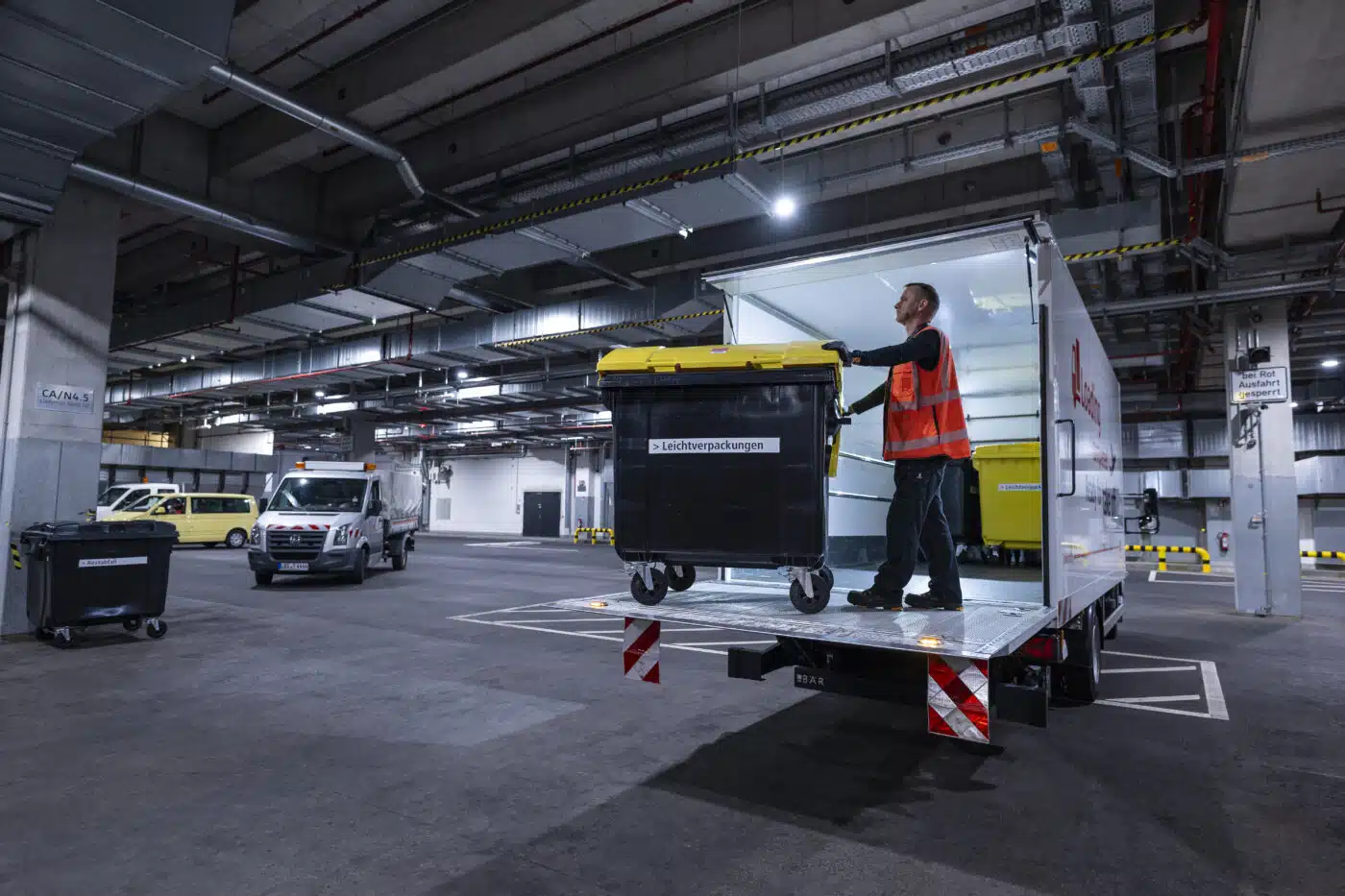 Les fractions standard sont principalement utilisées. papier, carton, verre, emballages en plastique et déchets résiduels. Cela inclut également les restes alimentaires des restaurants et des cantines, les déchets biodégradables, mais aussi des objets tels que les déchiqueteurs de dossiers des bureaux, les déchets, les déchets encombrants et bien plus encore. Par exemple, les aérosols ou les accumulateurs et autres dont le voyage se termine déjà par le contrôle des bagages à main. Des conteneurs spéciaux contenant des déchets dangereux tels que de l’huile usagée ou des résidus collectés lors du nettoyage des turbines d’avion figurent également sur la liste et les demandes spéciales proviennent souvent des douanes. « S’ils saisissent quelque chose qui ne doit pas être importé, des plantes exotiques, des graines, produits d’origine animale, nous les amenons directement à une installation d’élimination externe correspondante dans les environs de Berlin », explique Artur Heldt et ajoute : « c’est pourquoi nous avons choisi pour l’eCanter le pack batterie M avec deux accumulateurs et jusqu’à 140 kilomètres d’autonomie, même si le pack S nous aurait théoriquement suffi. Mais nous disposons ainsi toujours d’une réserve tampon pour de tels cas et n’avons besoin de recharger que tous les deux jours dans le cadre de l’exploitation quotidienne. »