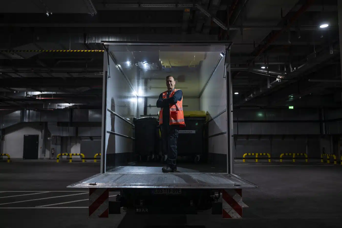 Le travail est exigeant, car l’élimination des déchets au BER a lieu 365 jours par an, en deux équipes, du matin à six heures jusqu’au soir à 22 heures. Jours fériés inclus. L’eCanter part de la cour de gestion des déchets de l’entreprise avec des conteneurs vides et les échange contre des conteneurs pleins dans les points de collecte des déchets désignés. Pour cela, il parcourt en moyenne 70 kilomètres par jour. « 60 % des tournées sont récurrentes chaque jour. À cela s’ajoutent 40 % de commandes pour lesquelles un service ou un secteur nous confie une élimination supplémentaire », explique Artur Heldt.
