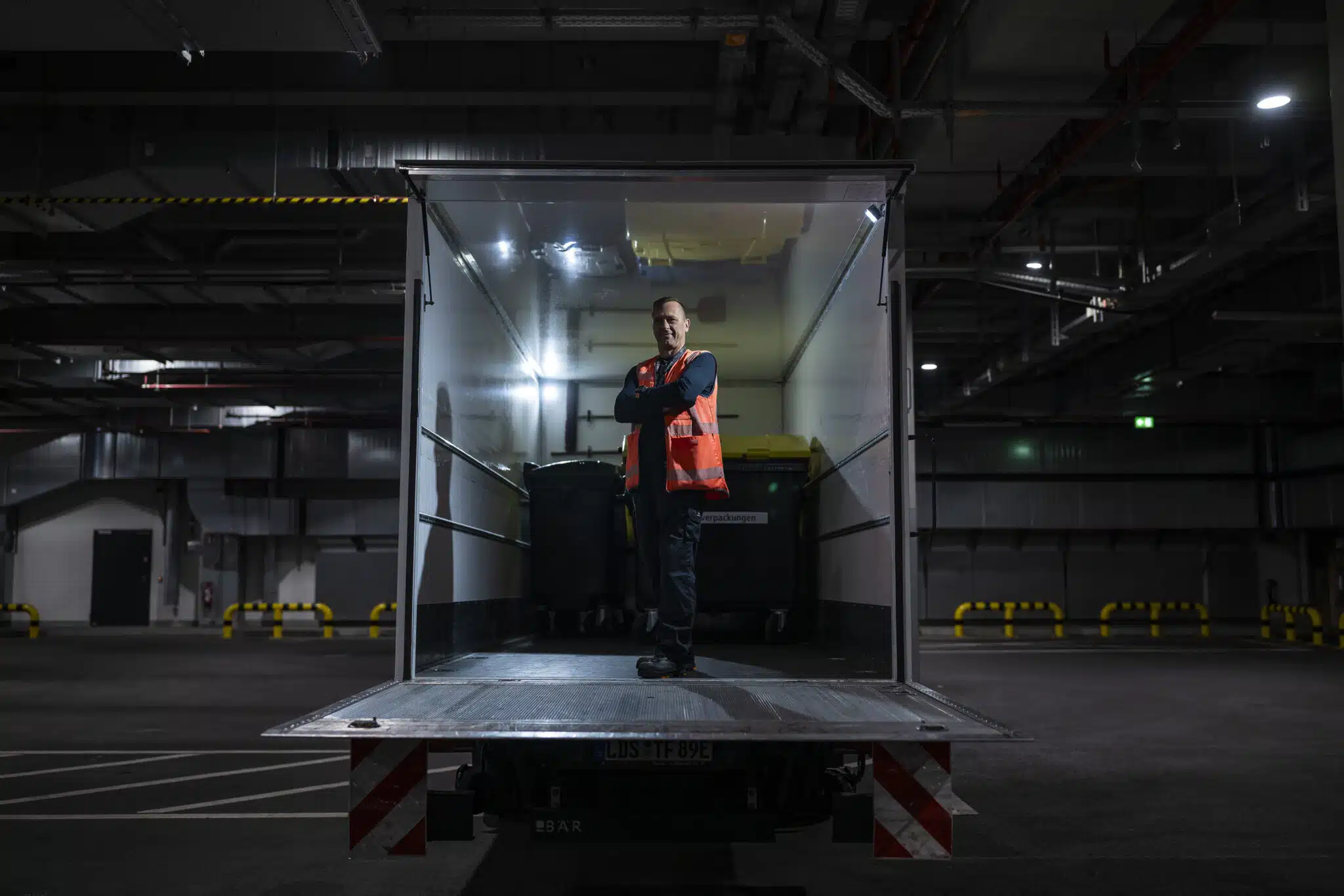 Un coup d’œil sur les bilans montre que le secteur de la gestion des déchets a traité au total près de 3 300 tonnes de déchets au cours de ladite période, répartis en 39 types appelés fractions. Compte tenu de ces chiffres, une logistique interne fluide, flexible, rapide, efficace et efficiente est indispensable. Le fait qu’elle fonctionne exclusivement en mode électrique depuis mai 2024 est encore tout à fait dans le sens de la stratégie de durabilité de l’aéroport. « Nous sommes déjà habitués à l’électromobilité grâce au covoiturage pour les collaborateurs, alors j’ai pensé, dans le cadre d’un nouvel achat de personnes, que cela devait aussi être possible avec un camion électrique », se souvient Artur Heldt.